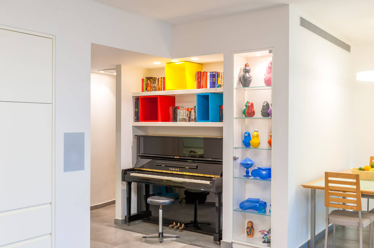 מדפים מקיר לקיר יכולים לתפקד גם כקיר כוח בחדר וגם כשטח תצוגה או אחסון.