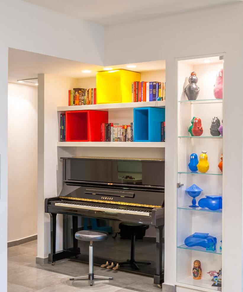 אם יש לכם פינה או קיר קטן, אפשר לשכור נגר שיוסיף כמה מדפים יפים שמשתלבים עם שאר הסלון. הקפידו לשמור על מדפים מינימליים בכדי למנוע מהחדר להיראות עמוס.