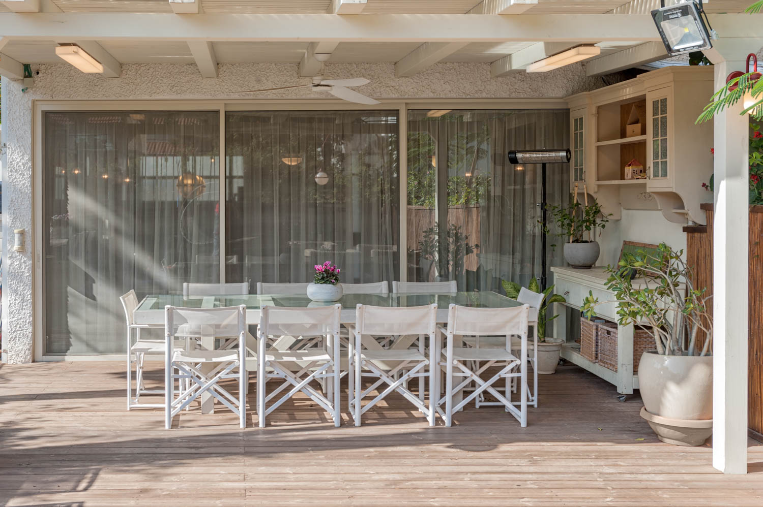 • השתמשו בשידת מגירות על מרפסת מקורה כתחנה להגשת אוכל ושתייה ולאחסון לצרכים חיצוניים, כמו כלים לברביקיו ופלייסמנטים.